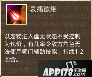 哀痛欲绝 :只能对敌对玩家使用,使用后宠物变为虚无状态无法控制,令对手无法使用师门辅助技能,技能提升到160级时持续2回合