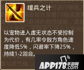 缓兵之计 :只能对敌对玩家使用,使用后宠物变为虚无状态无法控制,令对手速度降低5%,物理闪避以及法术闪避下降25%,技能提升到160级时持续2回合,此技能只能对玩家使用;