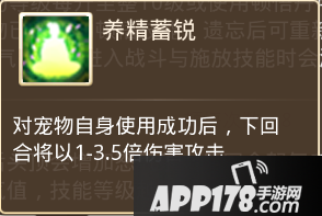 法宠专用,养精蓄锐 :只能自身使用,本回合不能操作宠物,提升技能到160级时、下回合将以2倍伤害攻击