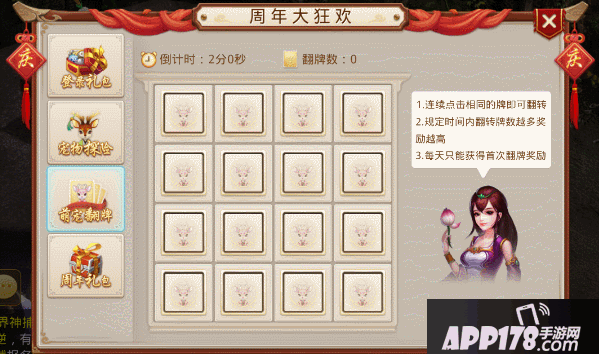 在随机刷出的的宠物卡牌格子中,点击任意两张卡牌,若相同则可翻开,不相同则不会翻开。规定时间内,翻开的卡牌数越多奖励越高。还有“翻牌高手”的称谓和成就可拿!
