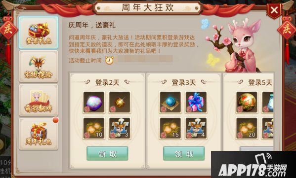 周年庆期间,累计登录达一定天数就可以领取相应天数的奖励(不需要连续登录)。