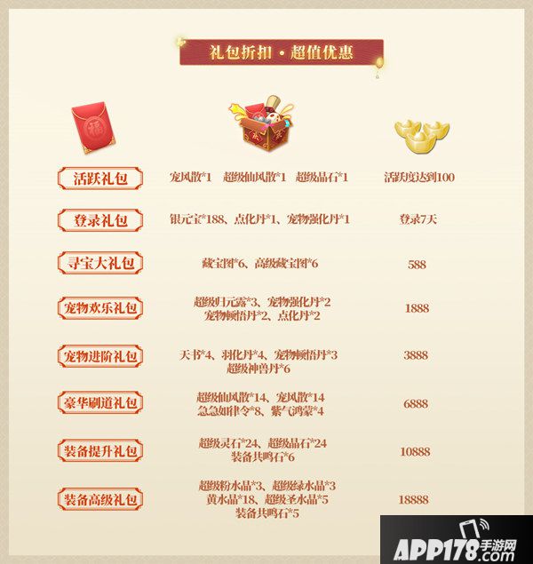 周年庆期间,也有一批超值优惠的礼包上架,包含挖宝、刷道助力、宠物培养、装备打造等等。累计购买达到一定数量,还可开启宝箱,有机会获得变异宠物、神兽、太极熊!