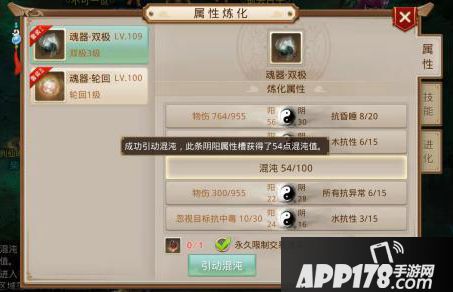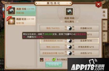 第二步,消耗20W金币进行两仪分化,随机分化出阴阳数值(阴+阳=混沌值),数值决定属性高低,这里阴或阳值最高只能达到混沌值的70%。