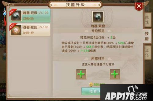 消耗两个副魂器(任意魂器)可以对主魂器进行技能升级,升级有几率失败,失败累积完成度,完成度100%也可以进行升级。魂器生效百分比和生效伤害或者增加气血数值随技能等级增加而增加。升级失败时每个技能等级累积的完成度如下: