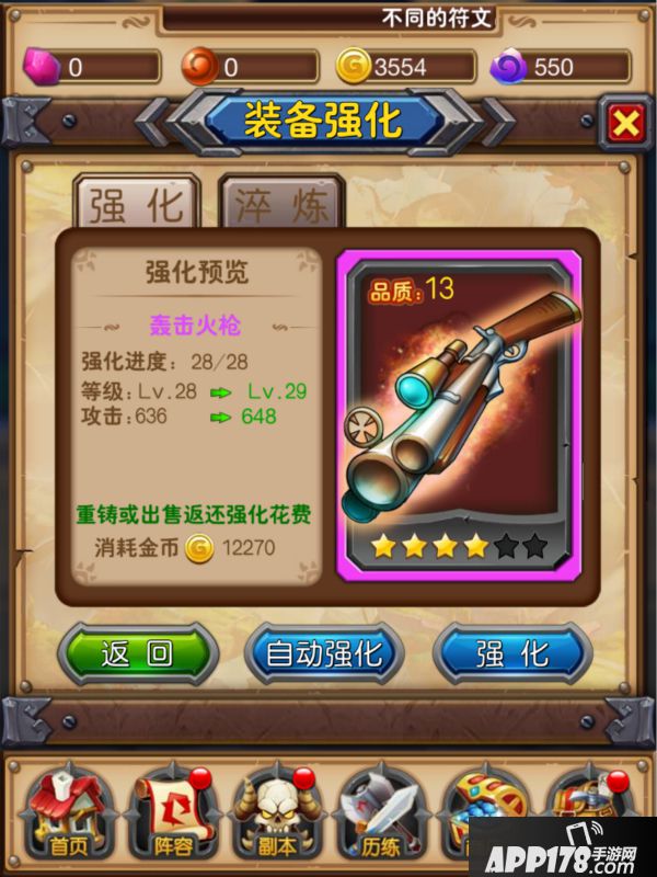 点击阵容中任意的英雄装备,进入装备信息界面,点击强化,分为强化和自动强化两种。强化是一次升一级,自动强化是直接升级到最高等级。装备升级的上限受角色等级影响,所以努力升级才是王道。