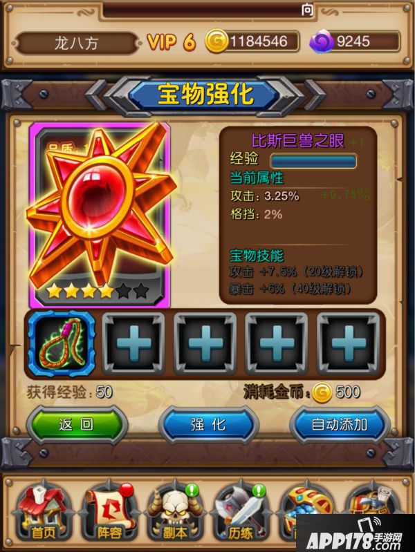 2、宝物强化时可使用自动添加功能,系统会自动按规则从宝物背包中选取符合条件的宝物作为强化消耗所用。