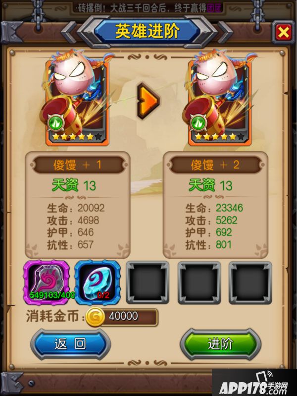 英雄可以消耗指定数量的道具来进行进阶,每次进阶都可以解锁一个天赋技能。