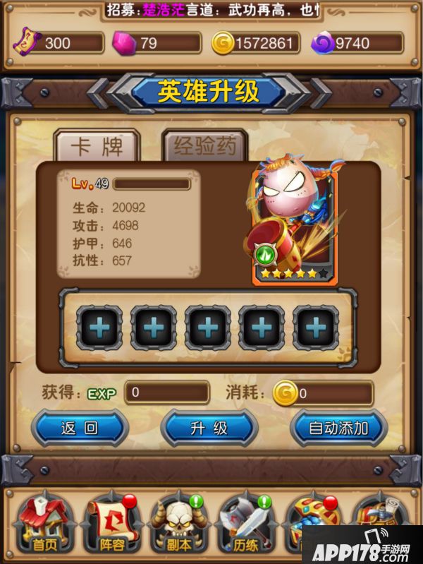 1、英雄可以通过吞噬其他的卡牌来提升等级,卡牌可以提供的升级经验按卡牌的品质和等级来换算。