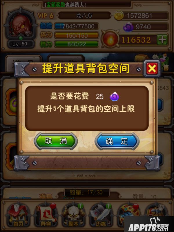 背包初始容量为30,点击扩充可以花费25符石提升5个背包的上限,第二次则是花费50符石,第三次75,以此类推。