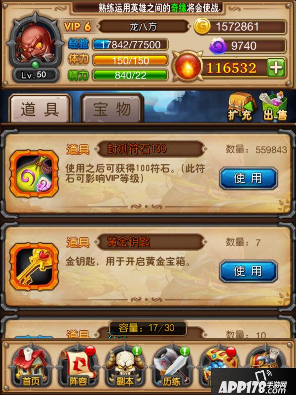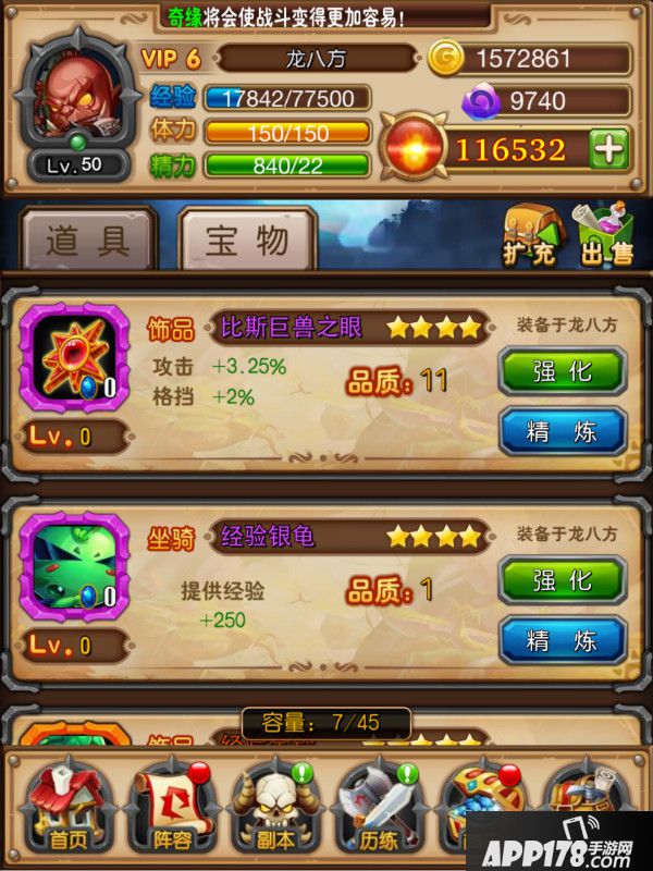 在游戏主界面点击背包按钮进入背包界面,背包分为道具包和宝物包。