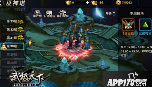 由于《武极天下》手游无副本无体力限制,玩家可尽情周游全地图秘境,不但可以追求等级速度,更可以获得大量物资及装备。途中偶遇的“盗宝小妖”会让你感到不虚此行!除了野外多人秘境,巫神塔也成为了重要突破口,前30层PVE层通关后有海量经验及橙色装备作为奖励,31-40层更晋升到PVP层面,通过1V1人人即时PK战获得的功勋可以兑换真原石来修炼升级,而巫神塔的1V1对战是讲究操作和策略的,pvp过程中还会出现怪物来捣乱,击杀怪物获得的buff会有助于你战胜对手,所以自动挂机是不行的噢~