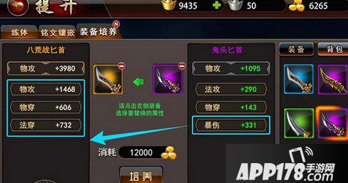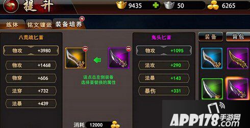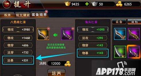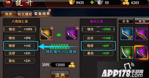 不更换基础装备的属性类型,而是将一个数值更高的属性替换过去,就是属性强化。如物穿加143的匕首强化成物穿加659的。