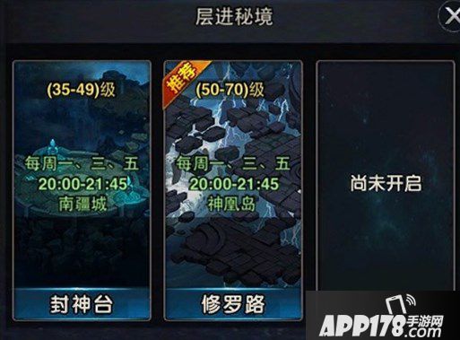 每周一、三、五20:00-21:45会在南疆城、神凰岛开启层进秘境封神台和修罗路。