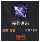 【光芒透击】开启一个状态,接下来3秒增强攻速和伤害而且普攻带穿透效果,可以伤害一条线上的敌人。