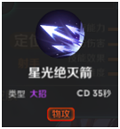 加点推荐:星光绝灭箭>光芒透击>星辰突袭,主升【光芒透击】技能,副升【星辰突袭】技能,有【星光绝灭箭】则升级【星光绝灭箭】