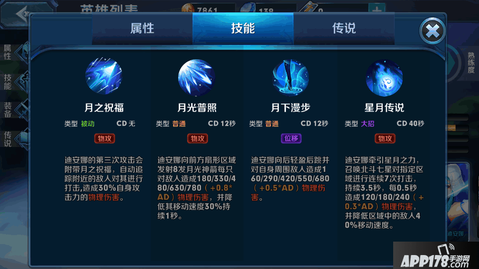 解析:位移技能,突进技能,用途广泛,对于一个射手来说,迪安娜的月下漫步简直就是一头猛虎的背上增加的一双羽翼,让其更加的威猛,伤害对于一个突进移位技能来说,不高也不低,一般般的那种,关键还是要想着怎么样才能让其爆发出更多的伤害,伤害要打在合适的地方。当然值得提醒的是,这个技能也可以用于穿墙之类的辅助功能。