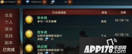 成就系统标签分为:总览,个人,社交,竞技,副本。每个成就只能获得一次,成就奖励的称号可以随意变换穿戴,不同的成就可以共享计数。