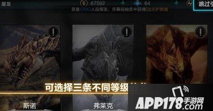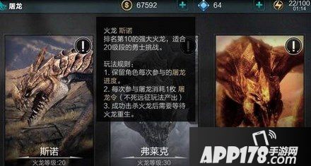 1、屠龙玩法,在玩家等级达到30级时解锁,这里有数只邪恶的火龙时刻守护着自己的宝藏,这些火龙一只比一只凶残,一只比一只让人绝望!目前的游戏版本开放了巨龙斯诺(20级火龙)、弗莱克(30级火龙)和米娅(40级火龙)三只火龙供玩家选择进行挑战。