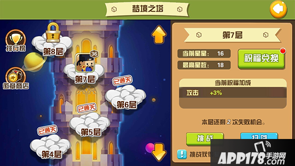 梦境之塔,大家可以一层一层的挑战,这样可以获得很多可用于强化战力的道具,层数越高难度越大,在超出预估所需战力后也可以使用增加属性道具来确保完美通关。