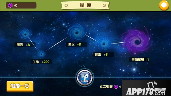 前期升级每个属性只需要1消耗个星星,但是随着星座的变化,属性的提升消耗星星也随之增加,一般获得星星以后就直接升级就好,它可以帮助你更轻松的通关副本。