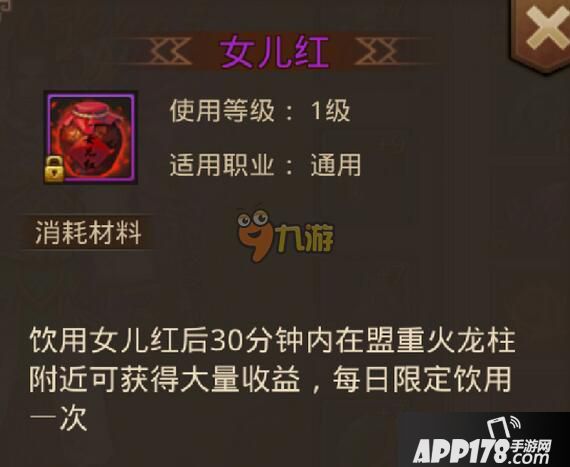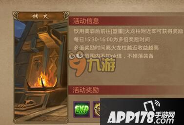 玩法介绍:参与活动需要消耗道具美酒“女儿红”,该道具可以从商城使用绑定元宝和非绑定元宝购买,击杀BOSS也有几率获得,在活动参与范围内会提示使用该道具,使用后可以持续30分钟,每日仅限一次,在每日15:30-16:00之间收益排行榜最好的玩家将获得“火焰之王”称号,那么如何收益最大化呢?就看您参与活动所处的位置了,离“火龙柱”越近收益越多,并且在活动区域内是不增长PK值不会爆装的,召集帮会兄弟一起来烤火,人多力量才大!