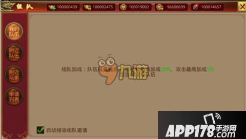 在任务按钮旁是“队伍”按钮,可以查看当前的组队状态。点击队伍按钮,可以开启组队面板成立队伍,游戏有,队伍成员越多,打怪经验/攻击加成越高。