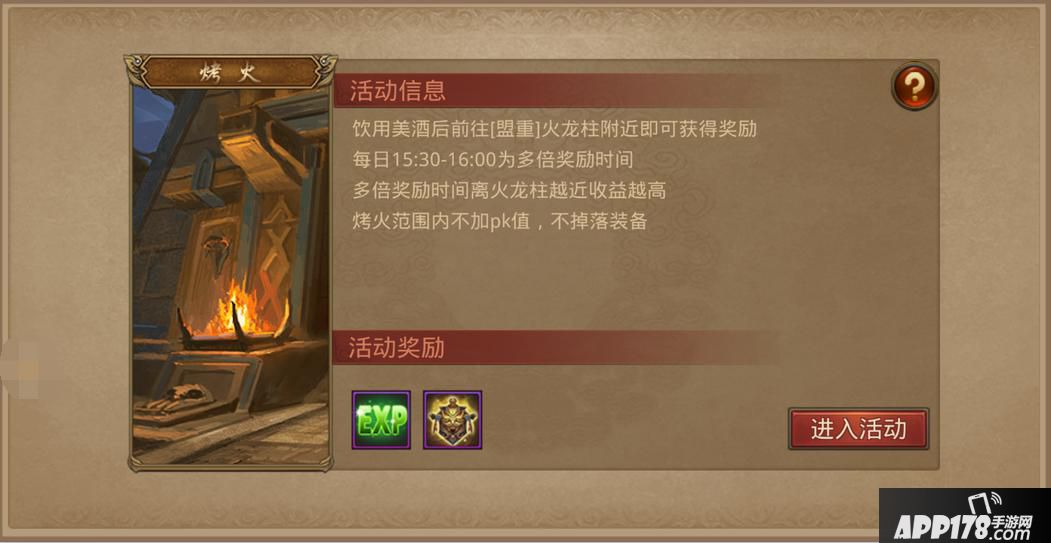 火焰之王也称为烤火活动,玩家只需要在【盟重】地区中的火龙柱附近使用“女儿红”道具即可获得收益。