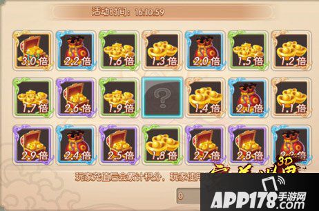 2.活动规则:活动期间,玩家每次充值均可获得充值积分,消耗充值积分参与摇奖,系统将根据摇奖倍数的积分数发放元宝,摇奖倍数越高返还元宝越多!最高3倍返还!预祝亲好运哦!