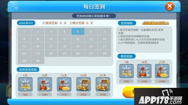 每天进入游戏之后,第一等大事——签到!每天签到可以领取一定的金币或奖券奖励,连续签到还可获得额外奖励!