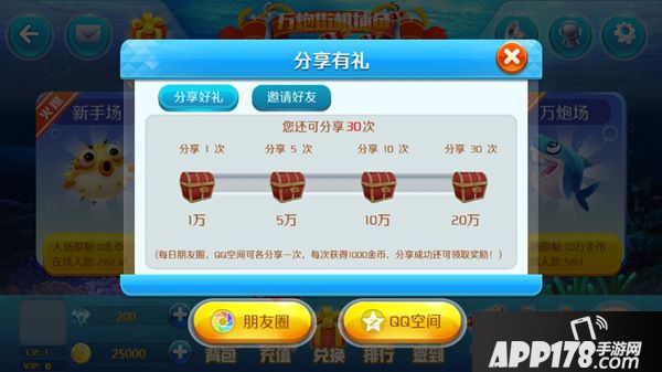 还在自己一个人捕鱼吗?为什么不分享给朋友呢,既可以收获一起捕鱼的乐趣,更可以获得金币奖励哦!点击左上角的免费金币,就可以参加啦!