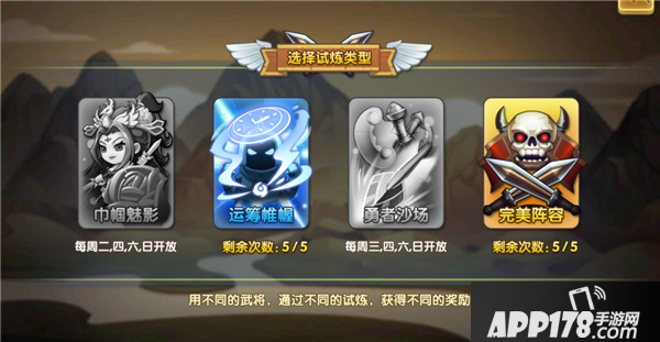 武将试炼这个系统呢在主公等级到达25级后开启,进入后共有4个本本,因为本本周期性的设定,主公每天只能挑战指定的本本,其余灰色的本本无法进行挑战。