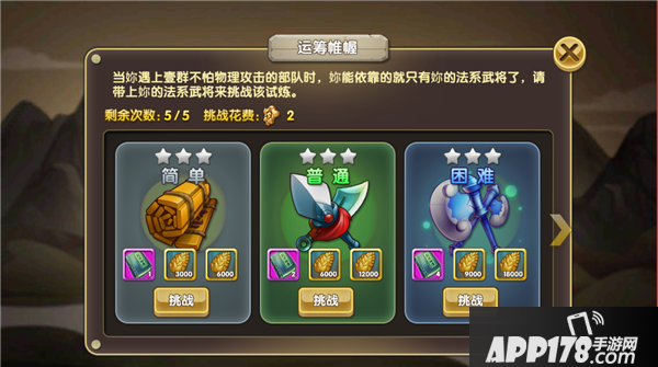 进入本本后主公会发现只能挑战简单难度的本本,因为普通和困难需要主公等级到达35和45级才能开放;每个本本每天都有三次挑战机会。因为本本属性的差异化,小编就对各本本作详细说明吧~
