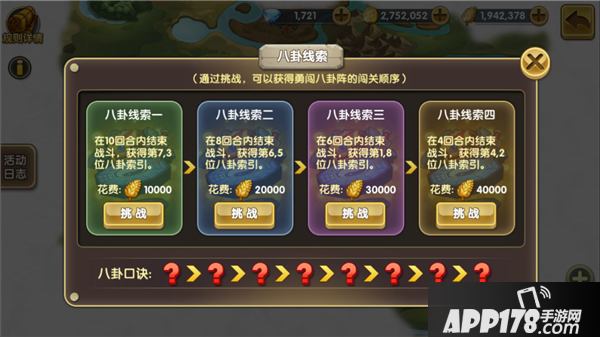 有了线索以后记得前往八卦阵进行闯关吧,有人说,我过不了我能不能硬闯,额这个,梦梦只能说,梦梦尝试了一把,结果战斗了四十多场才打到最后的,这个各位主公就自己看着办吧哈