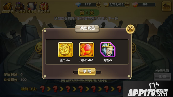 奖励方面:积分、八卦币、金币...这些都是八卦阵的产出,归根结底是武将魂石的搜集,积分和八卦币都是能够得到换取相应的强力魂石的。