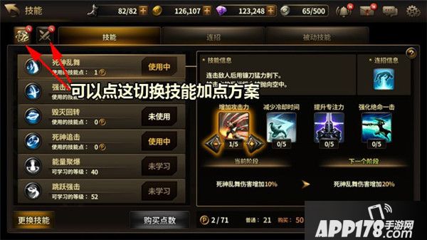 点击主界面左下角的技能按钮就能进入技能界面