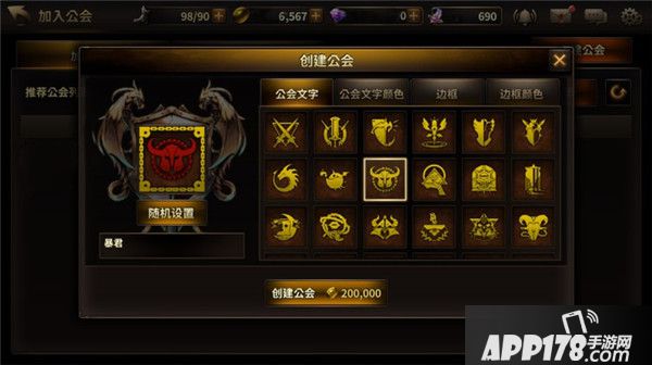 玩家可以加入到自己喜欢的公会,或选择自己创建公会;通过消耗20W金币,可以创建一个公会,设置一个响亮的公会名字,确定公会文字图标,颜色,边框等信息,点击“创建公会”可以成功创建公会;