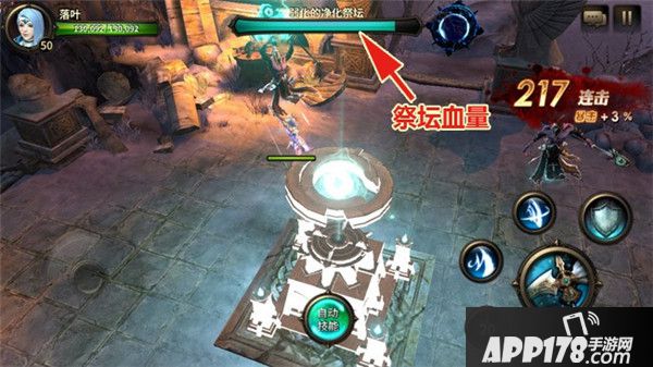 注意上图的蓝色血条就是祭坛的血量,同其他一些守护类游戏一样,玩的时候注意不要离开祭坛太远,攻击时尽可能的攻击到更多的怪物还是非常容易过关的!