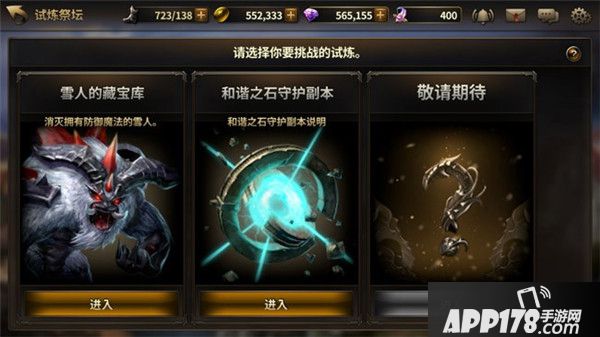 试炼祭坛是一个类似单人挑战副本的玩法,通过试炼祭坛玩法勇士们可以体验到各种不同类型战斗模式!开启试炼祭坛玩法需要通关石栏平原的第17-5关卡才行哦,所以要体验这个玩法还是有是一定的难度的呢。试炼祭坛每个模式一天只能进行一次,每天的24点会进行重置,所以各位勇士要注意时间不要浪费机会!目前试炼祭坛开放有‘雪人的藏宝库’和‘和谐之石守护副本’两种战斗模式,下面就各位勇士介绍下这两个模式的各自特点。