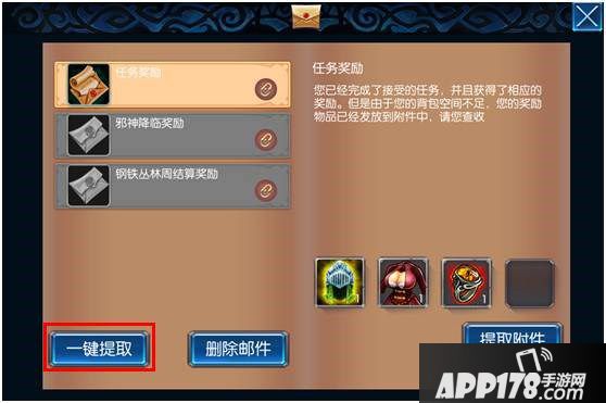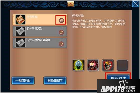 选中此类邮件,点击右下角“提取附件”按钮,则可以一口气提取完所有的附件——当然前提是背包有足够的空间。