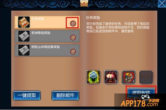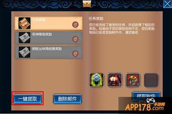 选中此类邮件,点击右下角“提取附件”按钮,则可以一口气提取完所有的附件——当然前提是背包有足够的空间。