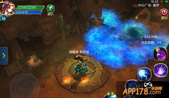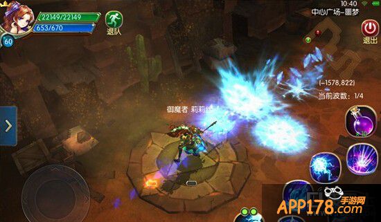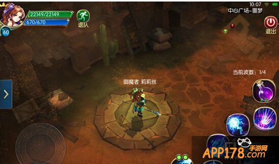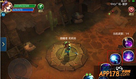 普通攻击旁的4个按钮为技能按钮,每个职业都有数个威力强大的技能,效果千变万化。点击按钮即可释放技能,释放技能需要消耗法力,法力不足则不能释放技能。