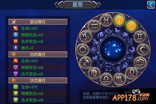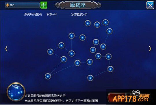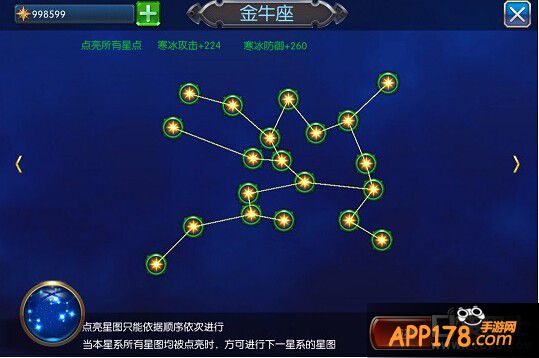 当满足了所有条件后,点击“点亮”按钮即可点亮星点,获得效果。若点满当前星图的所有星点,则除了星点本身奖励外,还可获得额外的奖励,该奖励在星图左上方显示。除了属性奖励,某些星图的额外奖励还可以获得特殊奖励,例如各种特殊头衔,相当拉风呢!