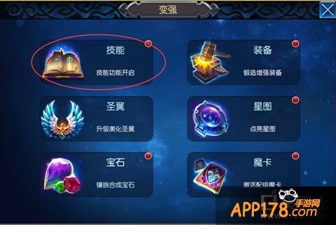 通过点击“角色界面”—》“技能”,或 “变强”标签—》“技能” 进入技能界面。