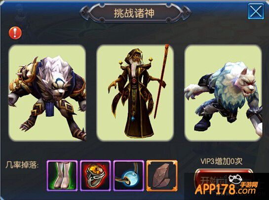 每天有2次挑战诸神的机会,每次都会随机生成3个boss,如图所示,点击“开始挑战”即可进入神殿直接挑战3个boss。