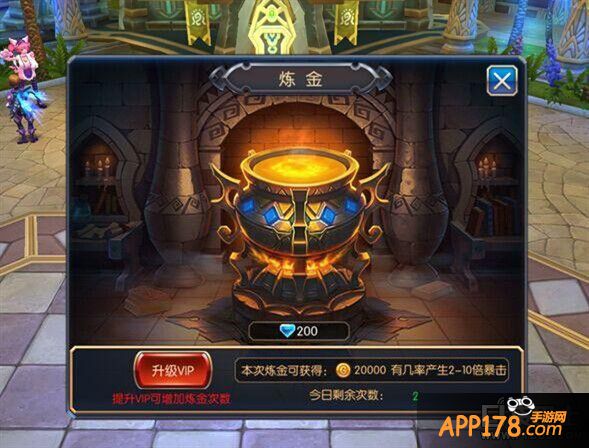无双剑姬每次炼金花费200蓝钻,每次都有几率产生暴击,暴击会获得基础金币2-10倍的金币奖励,物超所值哦!每日的炼金次数有限,升级vip等级可以增加每日的炼金次数,每天会赠送一次免费的炼金次数。建议每天使用一次免费的炼金,然后再进行5次炼金,看看会不会幸运的获得暴击,获得多倍的金币,炼金的暴击几率为20%,几率很高的哦!