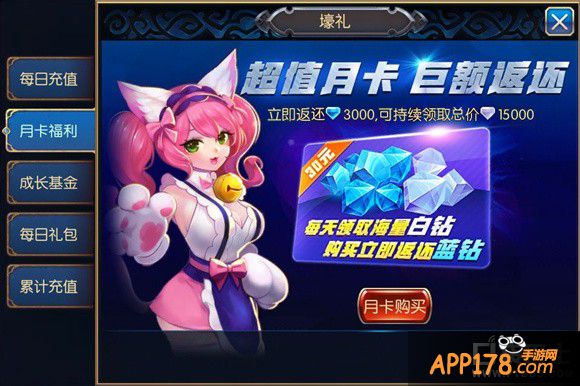 点开豪礼按钮,果然与充值有关,居然是充值返还系统。游戏厂商良心的设定,充的越多返还物品的价值越高。有些返还物品甚至超过了充值的金额。那么我们就来看看具体的豪礼返还物品的截图吧。