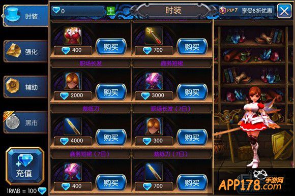 进入无双剑姬手游商城,可以看到有几大类,第一大类是时装,在这里可以购买角色的装束以及武器,有些装束和武器有时间限制,购买所需大量钻石。第二类是强化,在这其中可以选择购买各种强化石、宝石、开孔石等等、依然是蓝钻的需求量很大。不过这里的宝石也是升级装备提高战力的必需品,所以玩家可以多攒些钻来购买。第三大类是辅助,在这里可以购买复活币,在副本中可以立即复活。第四大类是黑市,需要VIP7才可以激活,VIP7以上还享受8折优惠。VIP的福利还真是高呢。。