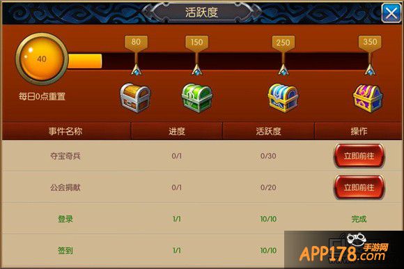 无双剑姬手游中的活跃度是每天完成任务的进度,在无双剑姬手游中完成的任何任务都在这里有显示,每个任务的完成都有相对应的活跃度值,在最上方有个进度条。活跃度达到一定数值后可以开启相对应的宝箱,最高350活跃值达到后可以开启最后的宝箱,得到相应的奖励。这也是记录你每天都干了什么、还有什么没干的记录单,方便玩家查阅。