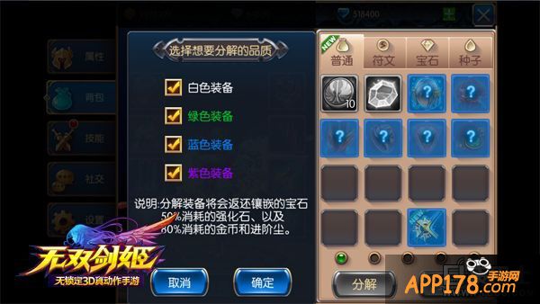 《无双剑姬》所有的装备都可以进行分解。在背包中点击装备弹出道具说明,点击说明右下方的“分解”按钮,点击确认即可分解装备。分解后装备消失,但可以获得金币,还有几率获得强化石或者完美强化石,这些是高级装备强化的必需道具。