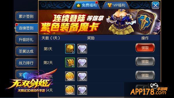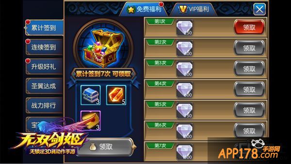 《无双剑姬》为玩家准备了丰厚的免费福利,每天登录游戏后,首先去签到领取累计签到和连续签到奖励。每日的炼金活动第一次是免费的哦,点一下就可以领取金币,千万不能错过。另外每天还有在线奖励,在游戏的过程中,就可以通过不断的在线累积时间来领取在线奖励。